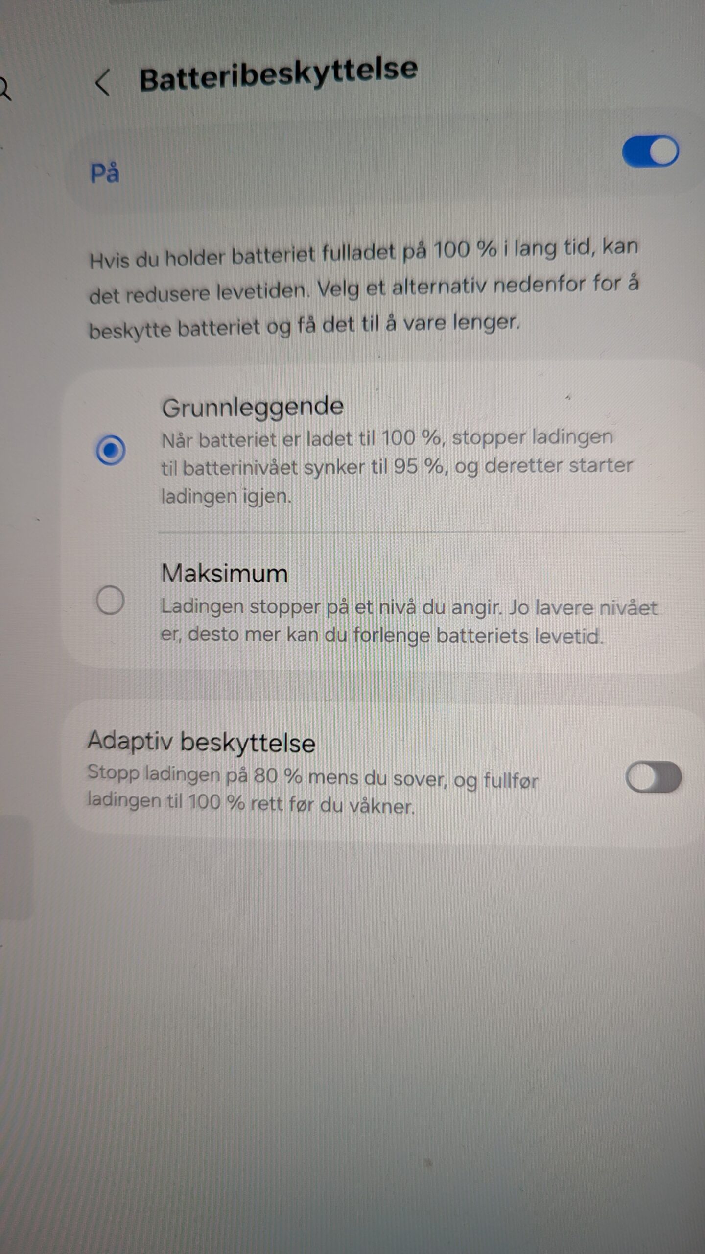 Samsung: På denne telefonen kan du velge mellom 3 varianter av batteribeskyttelse: Grunnleggende, Maksium og Adaptiv beskyttelse. Se i bildet hva de 3 variantene innebærer