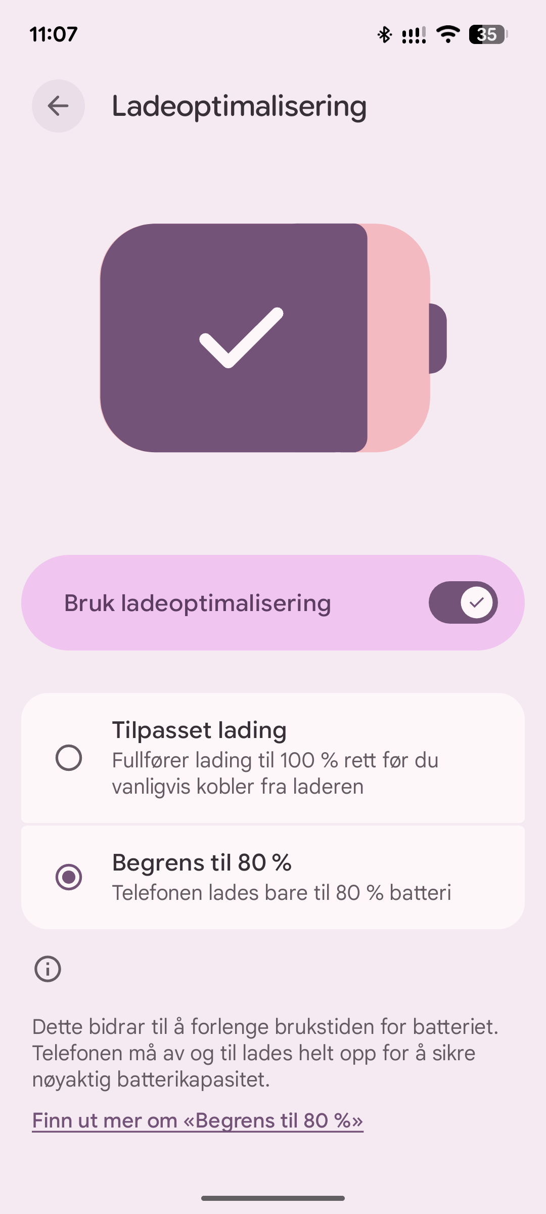 iPhone: Valg av «optimalisert batterilading». Når denne er slått på har telefonen én måte å optrimalisere ladingen.