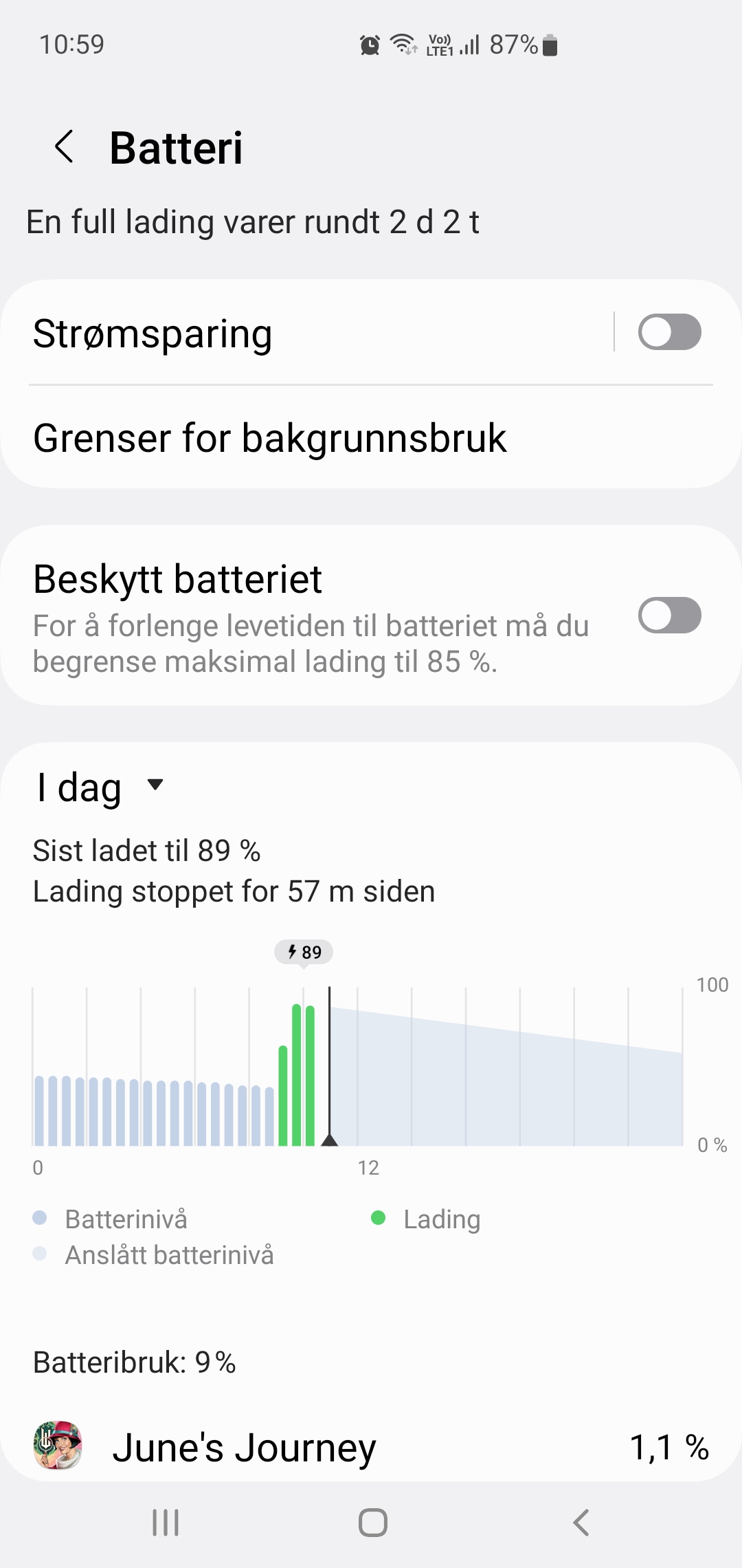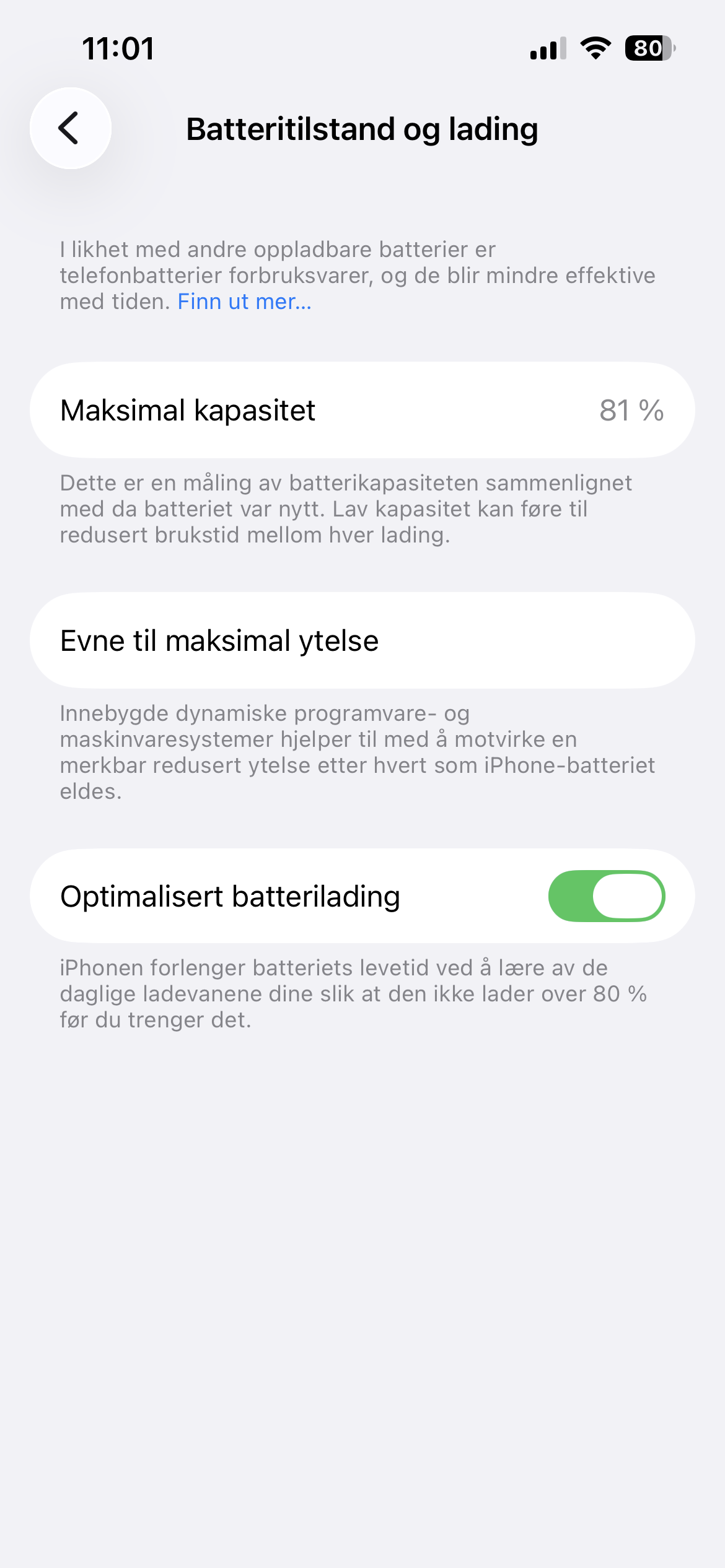 Se om det står noe om batteritilstand, ladning, ladeoptimalisering eller beskytt batteriet.
