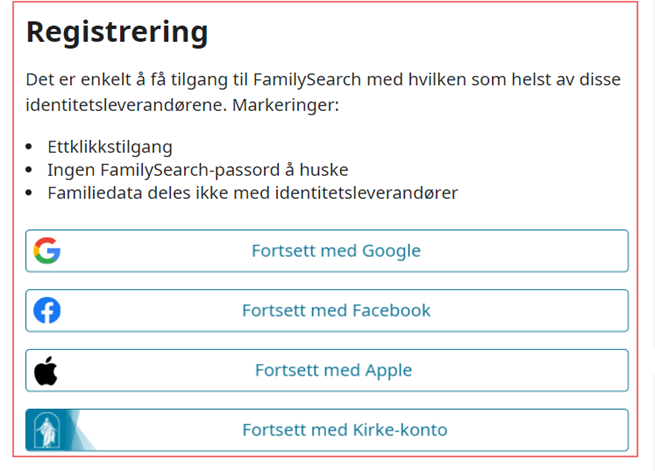 Nytt nå er at du kan registrere deg ved hjelp av eksempelvis Google konto, Facebook, Apple eller Kirke-konto, noe som gjør at du slipper å lage nytt brukernavn og passord.