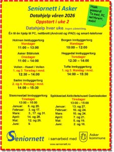 Seniornett Asker tilbyr i samarbeid med Asker kommune møteplasser hvor innbyggere kan skaffe seg digitale kunnskaper og ferdigheter. Vi har hele 10 møteplasser i kommunen hvor vi driver veiledning.