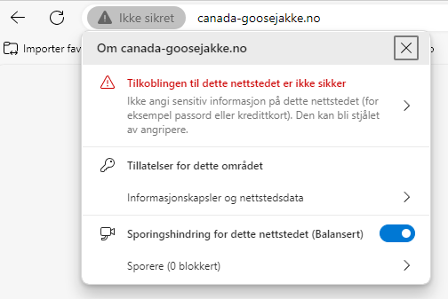 I eksemplet nedenfor kan du se hvordan nettleseren Edge gir informasjon om nettsiden. Hvis det ikke er et hengelåsikon, advarer nettleseren mot å legge igjen sensitiv informasjon som passord og kortinformasjon.
