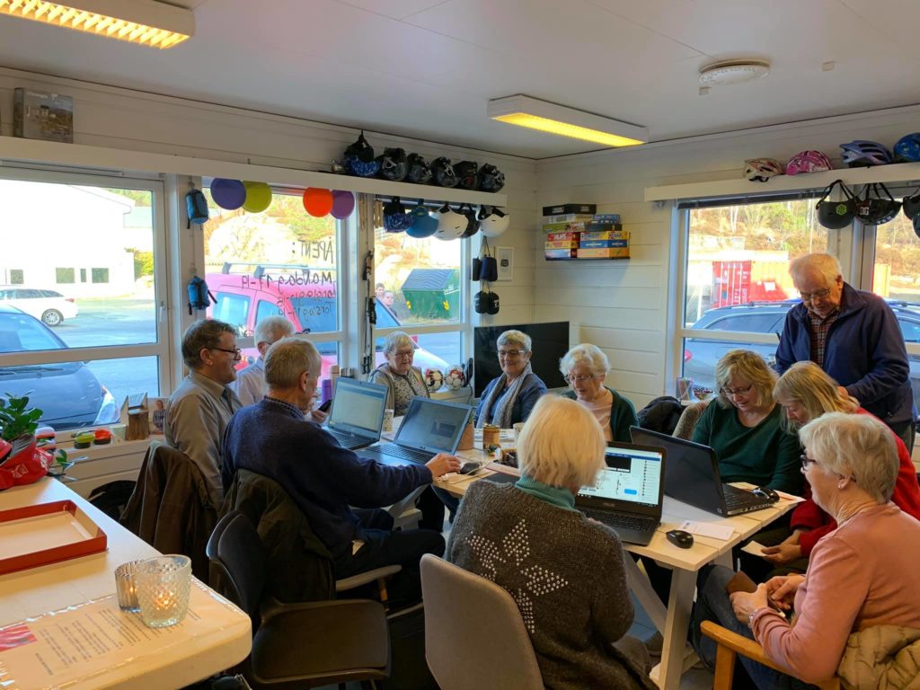 Annakvar torsdag møtes ein god gjeng på Sambrukshuset i Sveio for å løyse digitale utfordringar og ha ei sosial stund saman. Me har fleire rettleiarar som byt på å hjelpe til, samt at me også har ei samtalegruppe på facebook der me held kontakten og hjelp kvarandre med smått som dukker opp mellom møtene.
