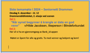 Vi merker det også i Seniornett. Snart skal vi har årets siste temamøte. Det kommer 4. desember og hoved-tittel er: «Når synet begynner å krangle er data en god venn.» Det er et tema som henspeiler på at vi blir eldre og en del funksjoner hos oss kan endres. Temaet kan være mer aktuelt enn vi aner. Mer informasjon om det møtet kommer seinere. Møtet er åpent for alle og gratis.