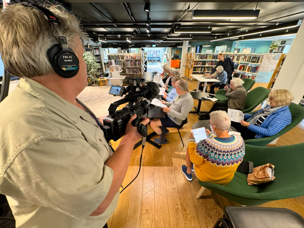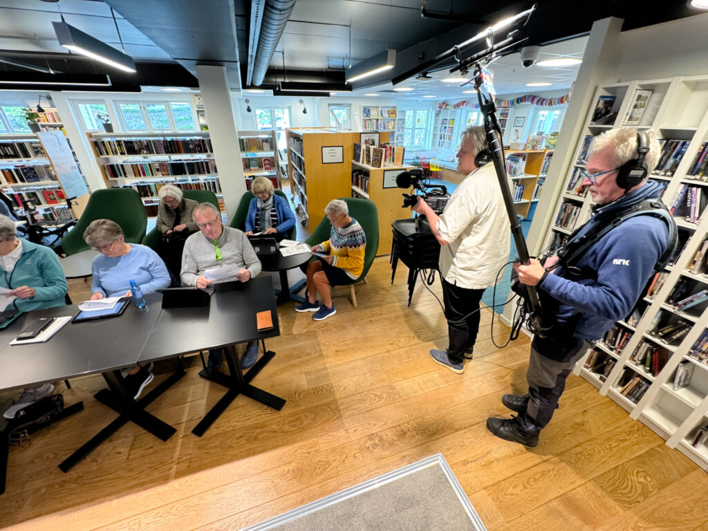 NRK filmer «Seniorsurf» på Biblioteket i Bekkjarvik. Foto: Thomas Halleland.