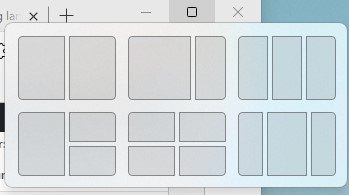 Snap-bar dukker opp når du holder markør (ikke trykk) over maksimerings-symbolet (som ligger mellom minimerings-symbolet og lukk vinduet øverst til høyre i vinduet ditt). Når du holder markøren der dukker dette opp: