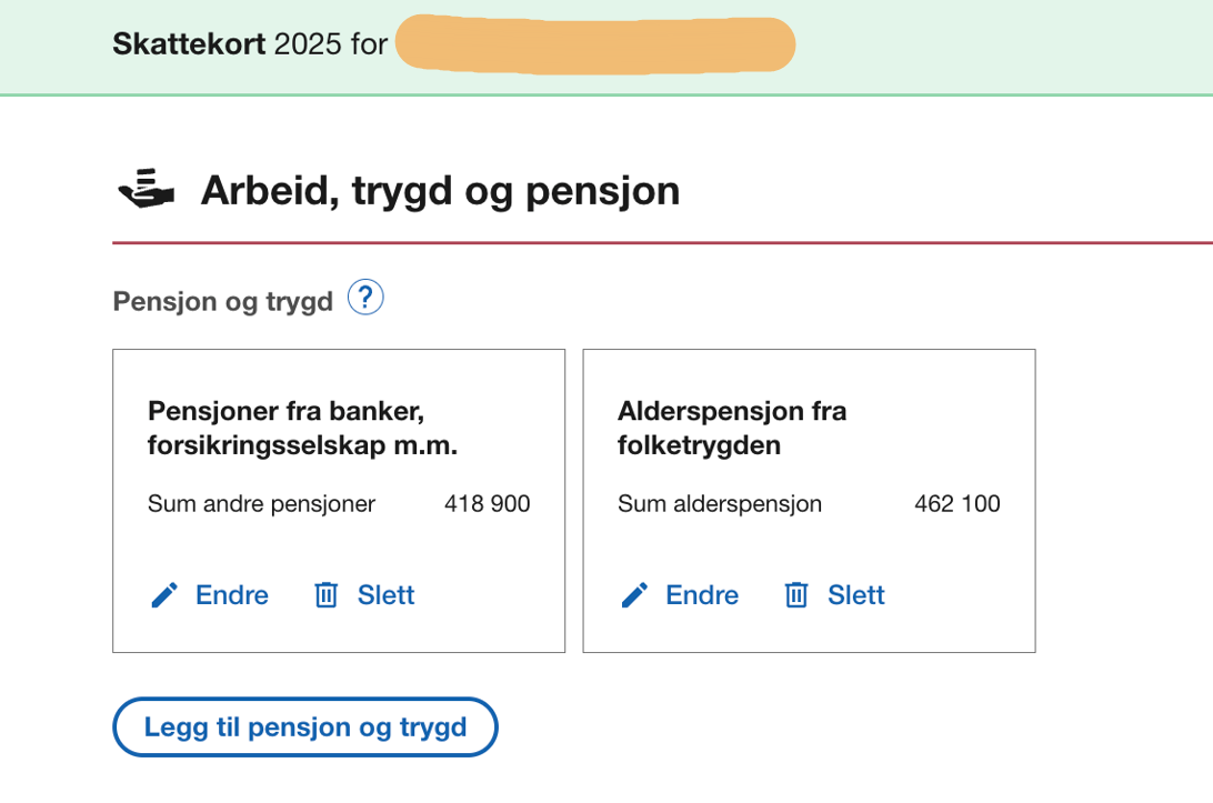 I tillegg til at skattekortet har blitt temabasert, har det «kort» som inneholder opplysninger knyttet til et av temaene, for eksempel pensjon. Her kan du endre opplysninger og legge til nye.