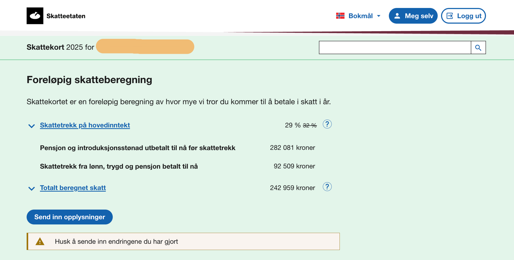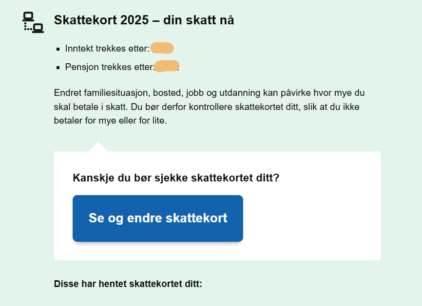 Selv om skattekortet ser nytt ut, er opplysningene de samme.  De fleste ser nå skattekortet med nytt utseende, men ikke alle. Når skattekortet for 2026 kommer i desember i år, får alle skattekortet med det nye utseende.