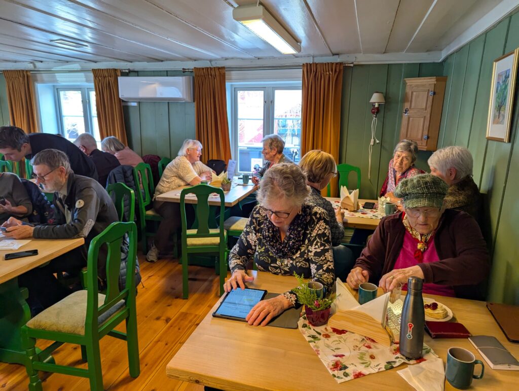 Aktive deltagere hadde mye å spørre de ulike veilederne om, samtidig som vi kunne skravle over en kopp kaffe. Mange hadde med telefon, noen hadde med pc og noen nettbrett. Det ble lastet ned apper, oppdatert pc og annet verktøy eller bare snakket. Et hyggelig treff som frister til gjentak!