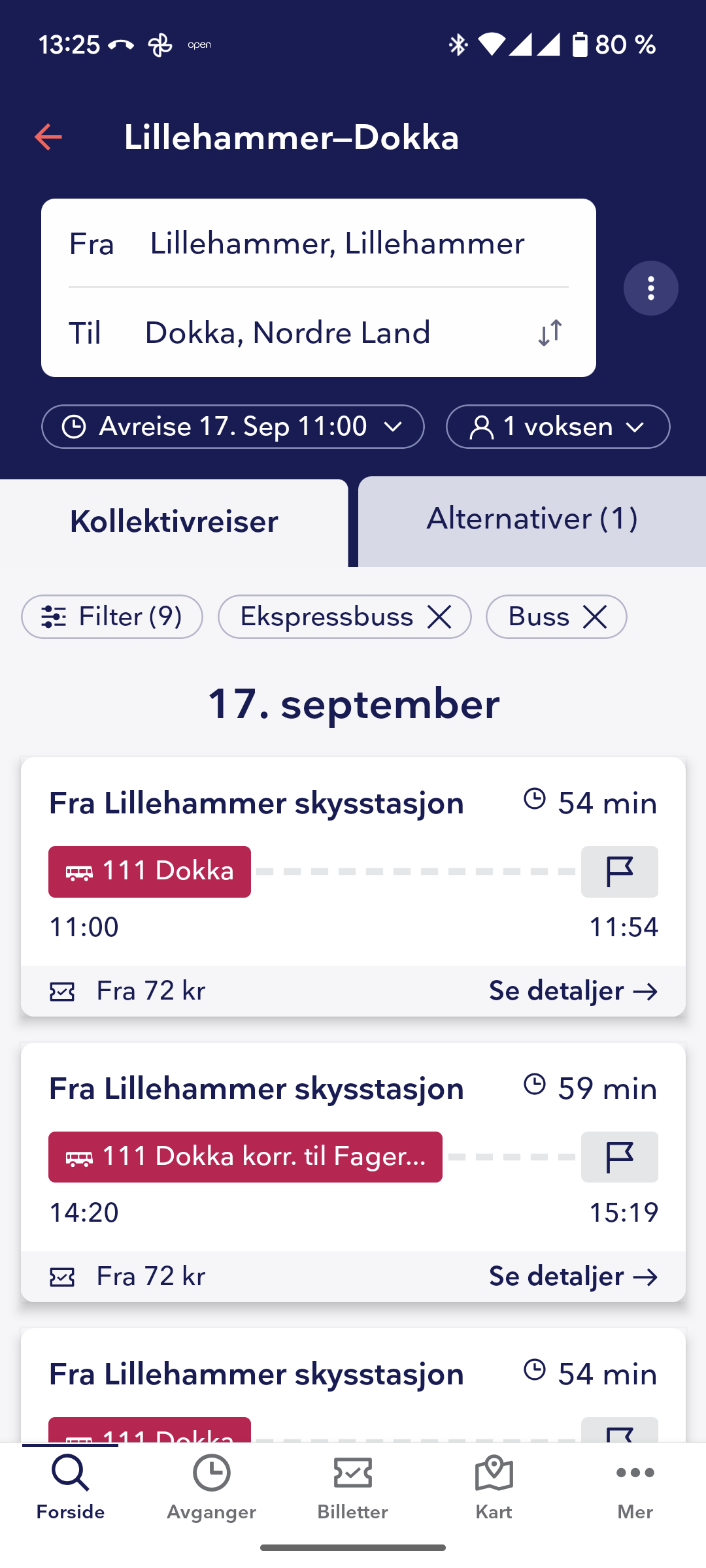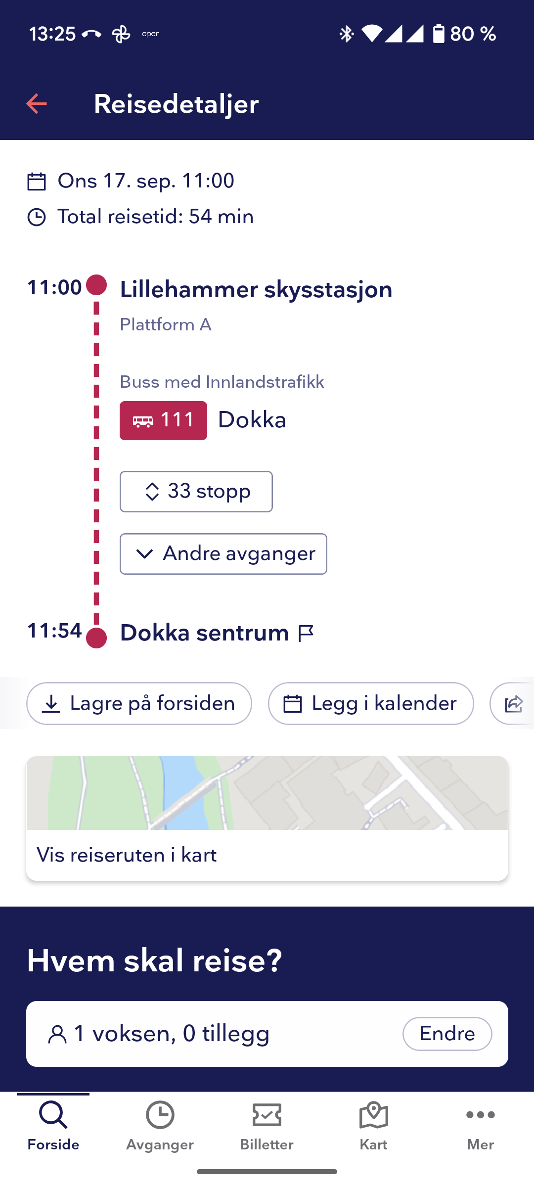 Her er et eksempel. Jeg prøver å finne en reiserute fra Lillehammer til Dokka. Skriver inn Lillehammer i Avreisested og Dokka i Destinasjon. Da kommer denne: