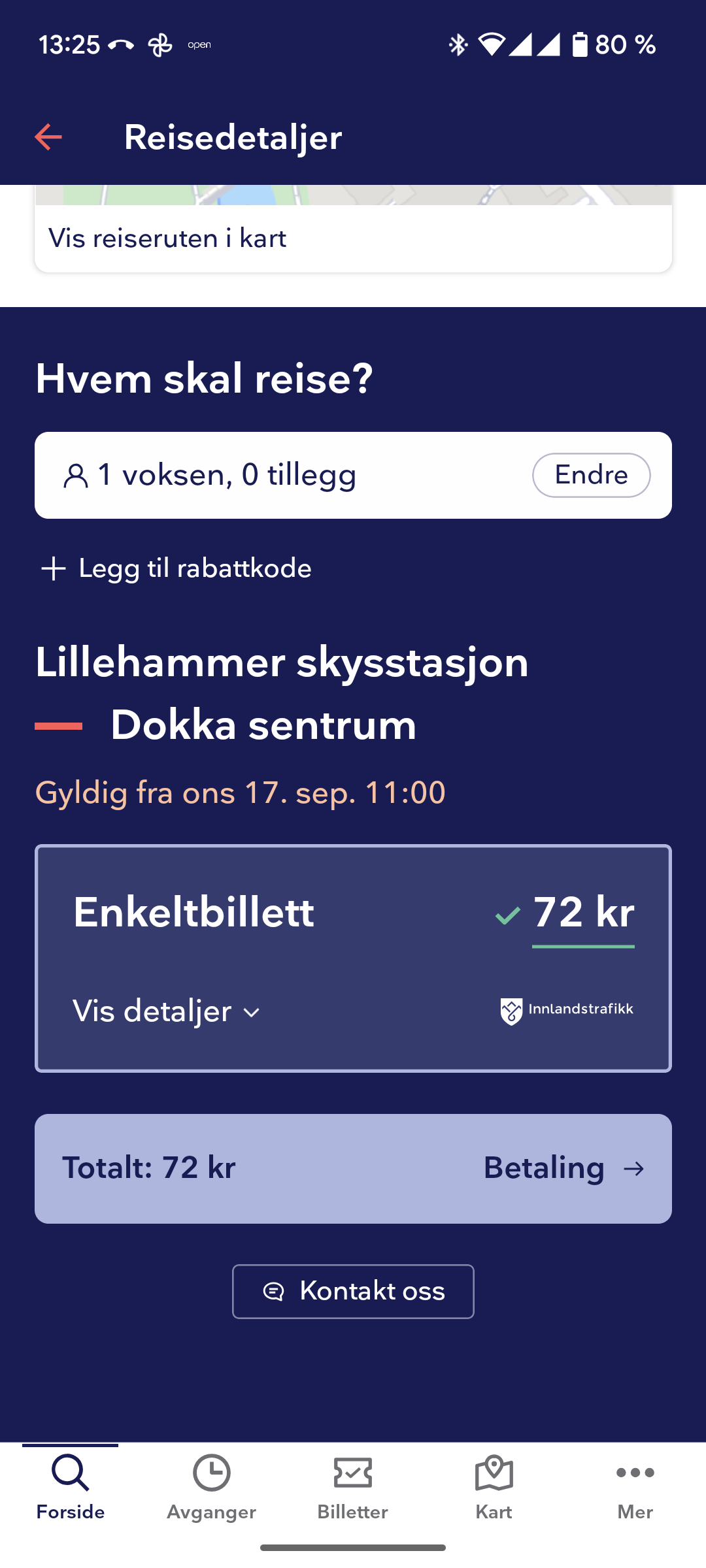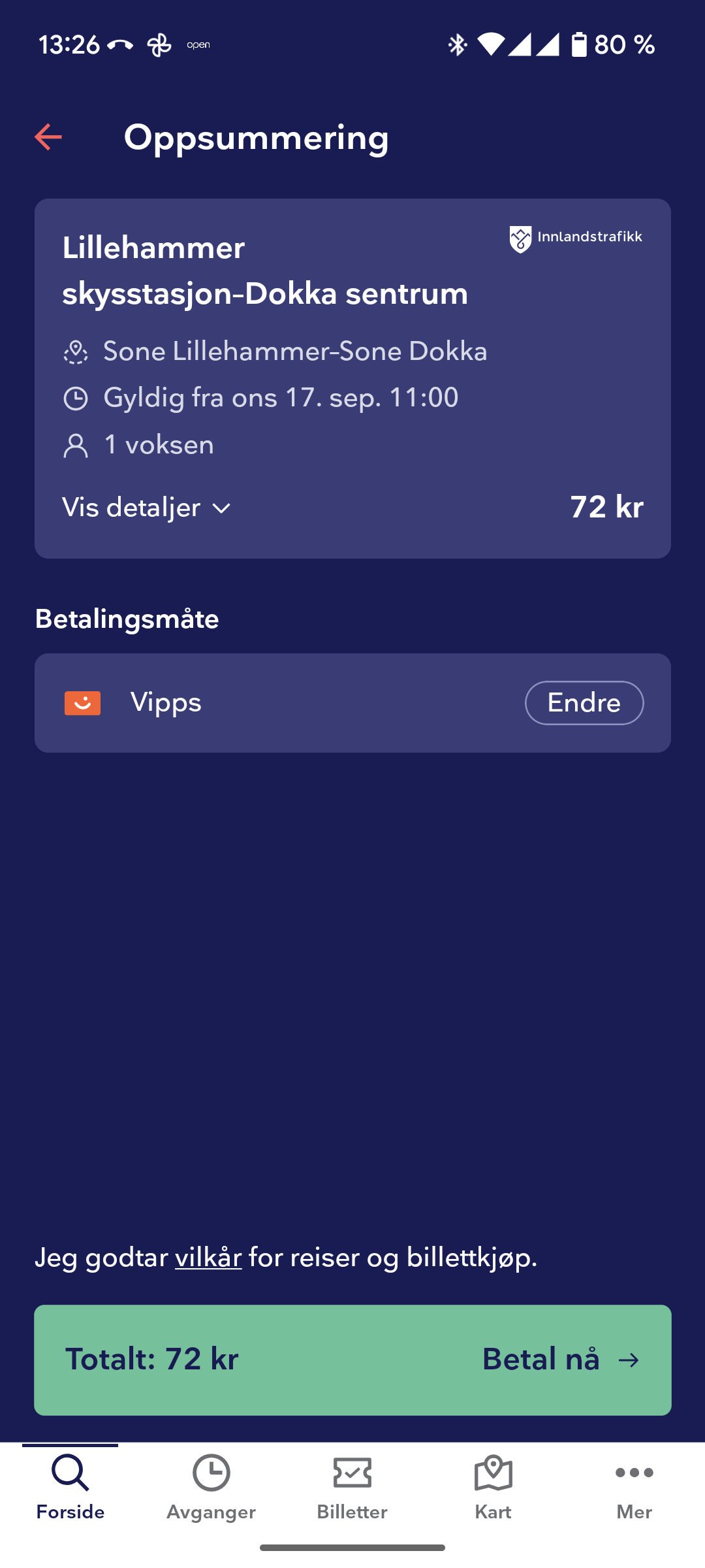 Jeg få kun opp Vipps som betalingsmåte fordi jeg ikke har lagt inn noen betalingskort. Vipps fungerer for meg. Vil jeg kjøpe billetten er det bare å trykke på Betal nå ->