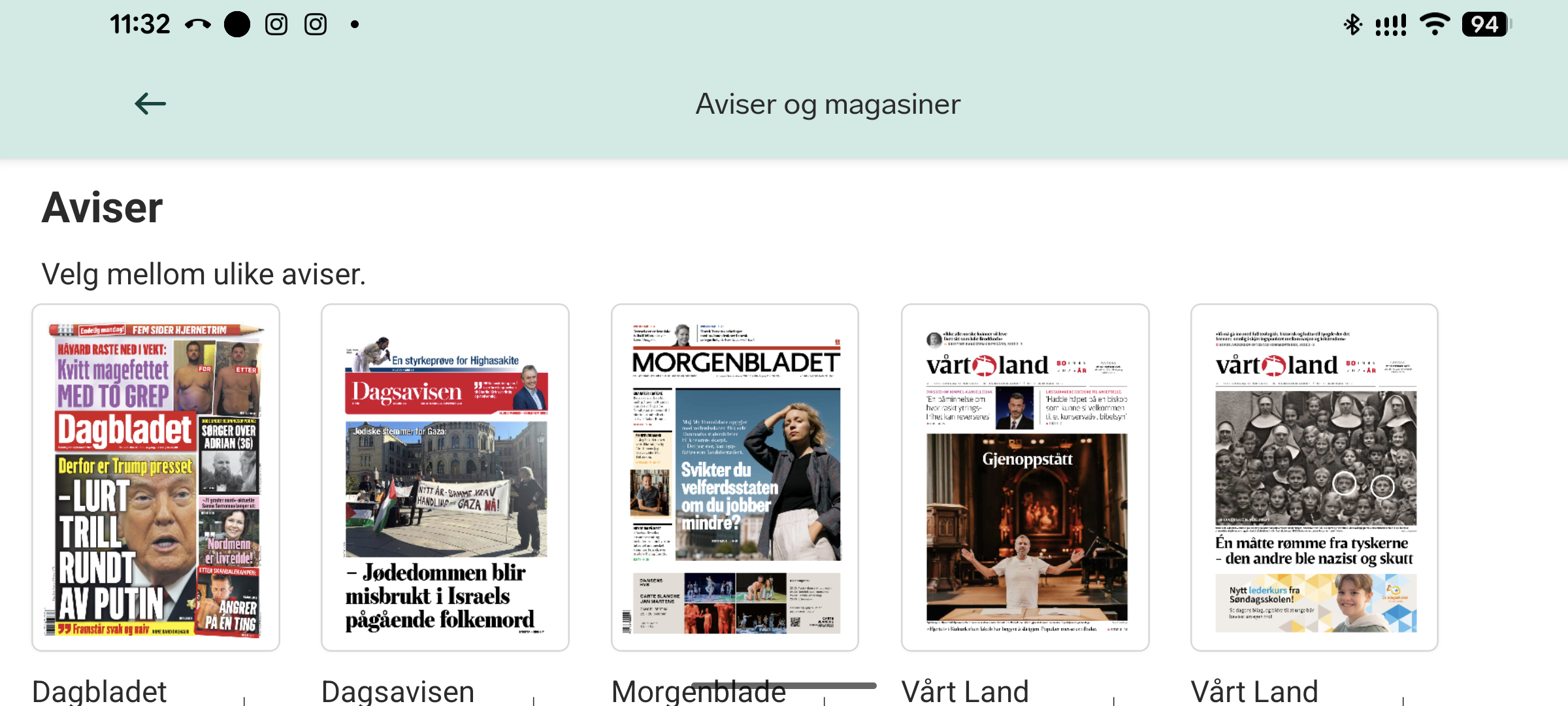 Du vil se dagens utgave av Dagbladet, Dagsavisen og Vårt Land. Du vil også se siste utgave av Morgenbladet (den kommer ut kun hver fredag).