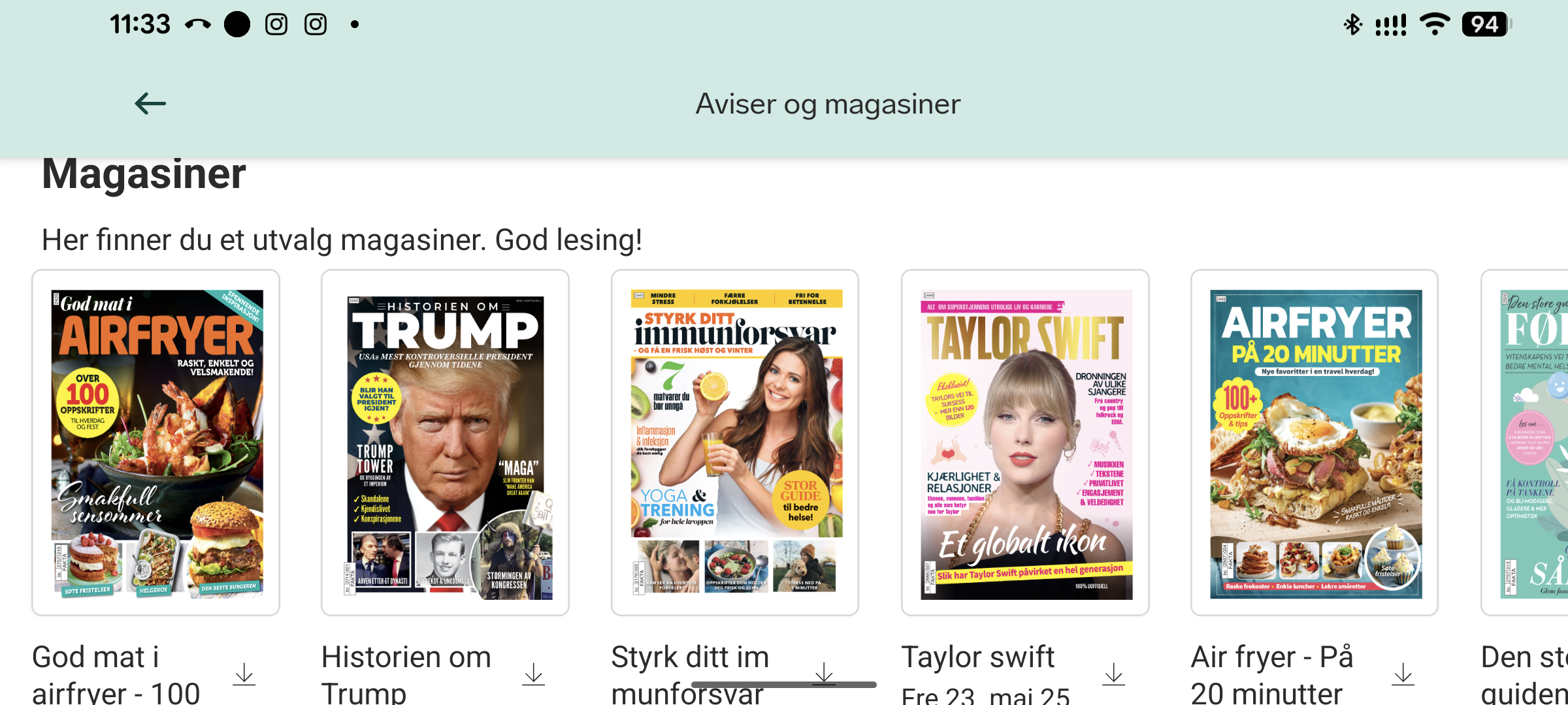 Vil du lese en av avisene eller magasinene? Trykk på den og den lastes ned til ditt nettbrett/telefon.