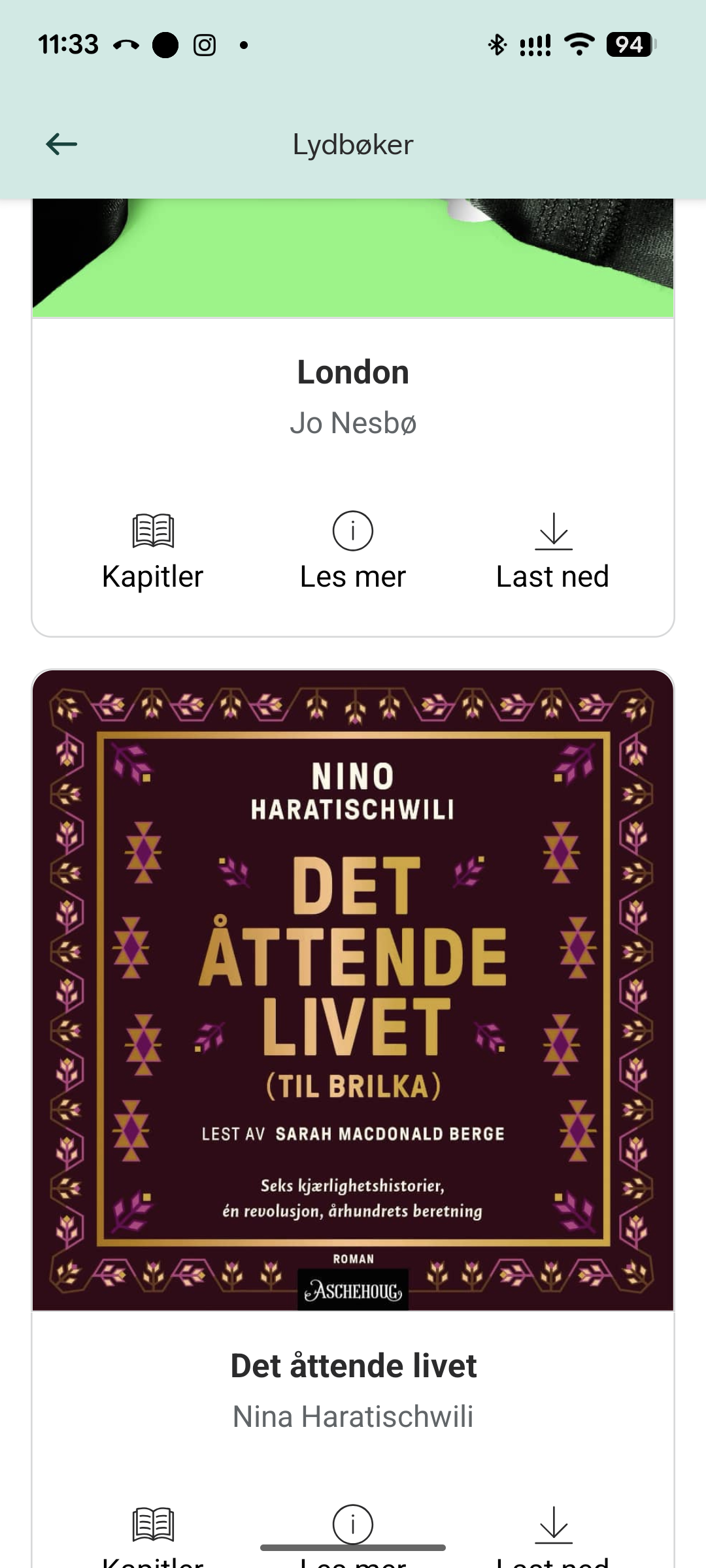 Flere lydbøker listes opp (her ser vi kun 2) når du ruller nedover. Vil du høre på en, trykk på den. Da lastes den ned til ditt nettbrett/telefon.