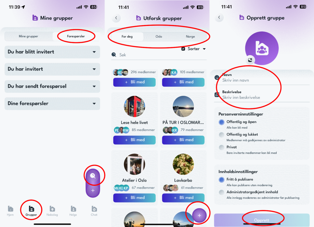 For å få enda mer tilpasset dine interesser i nyhetsoppdateringen, kan det være lurt å bli med i noen grupper. En gruppe er en felles interesse som noen har opprettet som gruppe. Denne kan du så melde deg inn i hvis den er åpen. Se bildene under. Start med å trykke på gruppeknappen nederst på skjermen. Trykk på forstørrelsesglasset. (begge med rød sirkel). Du vil da komme til bildet i midten under. Her kan du velge mellom «For deg», «Oslo» (hvis du bor der), eller «Norge». Hvis du finner en gruppe du ønsker å være med i trykk på blå knapp, «Bli med».