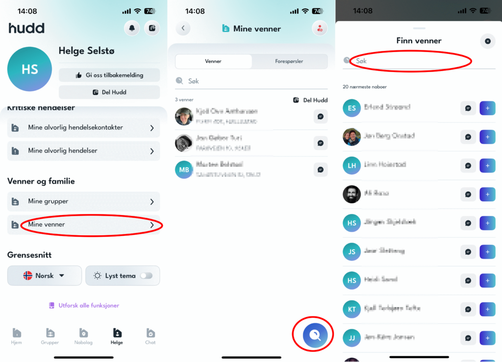 Etter å ha brukt Hudd i ensomhet en stund, vil du raskt finne ut at du trenger noen venner i appen. Det enkleste da er å trykke på huset nederst på skjermen, med navnet ditt. Deretter trykker du på «mine venner», som du ser i bildet under. Trykk deretter på forstørrelsesglasset nederst til høyre. Da vil du få opp en liste over dine nærmeste naboer. Du kan også skrive inn navnet på personer du kjenner i søkefeltet øverst. Hvis de også er på Hudd, dukker de opp som forslag og du kan knytte kontakt. Det gjør du ved å trykke på blå boks med plusstegn til høyre for navnet.