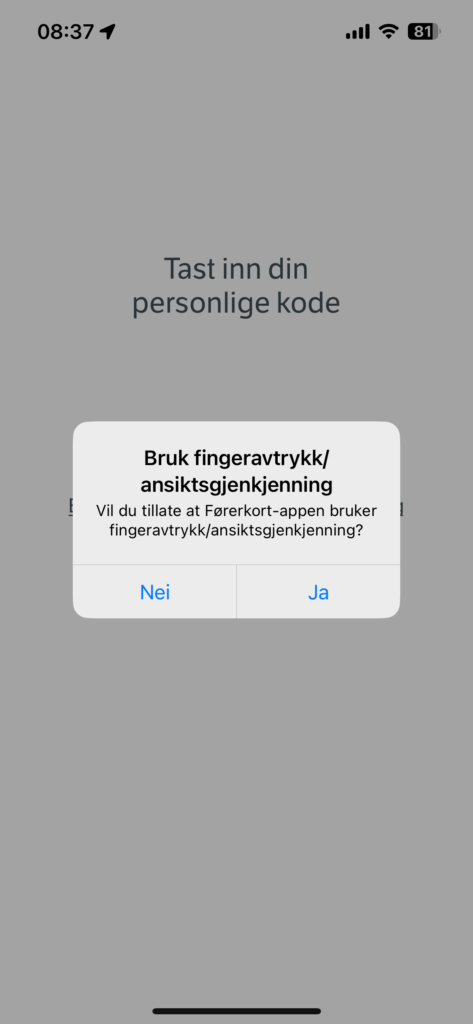 Etter at du er logget inn vil du på telefoner som støtter det få spørsmål om du vil bruke fingeravtrykk eller ansiktsgjenkjenning for å logge deg inn i appen. Sier du ja til det vil innloggingen være mye raskere neste gang. Det kan være greit dersom du blir stoppet i en kontroll og må vise førerkortet til politiet eller Statens vegvesen.