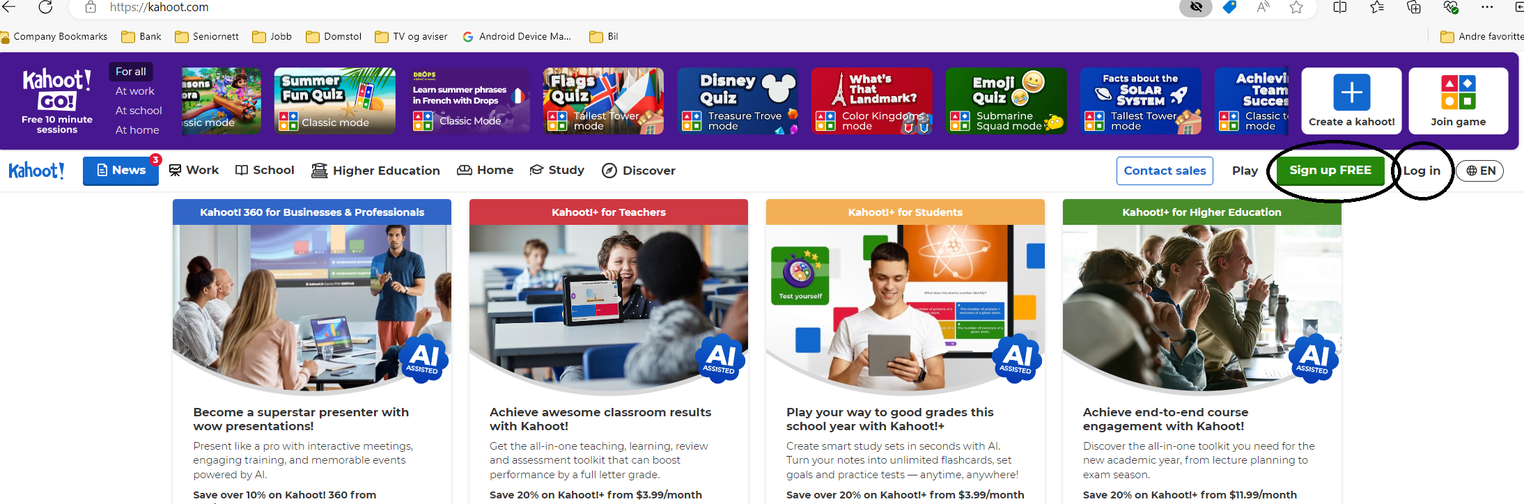 På PC, gå inn på https://kahoot.com/ Da møtes du av et nettsted med masse info. Det du bry deg om er «Sign up Free» eller «Log in»