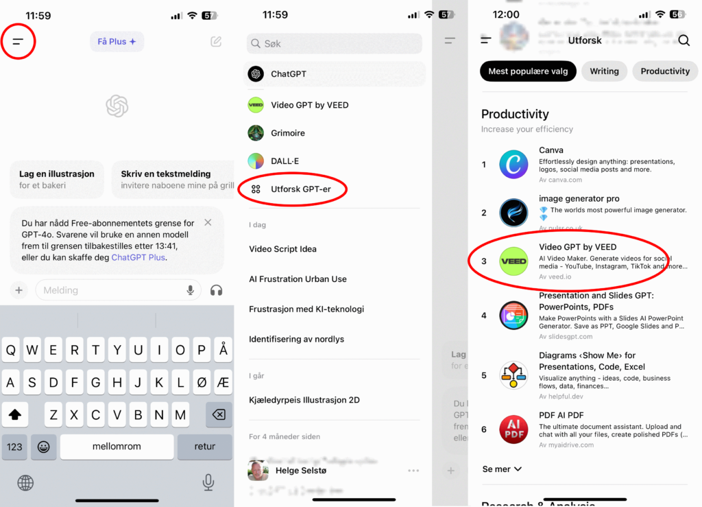 Inne i ChatGPT-appen er det mange nye muligheter. Du kan selvsagt chatte med tekster på vanlig måte. I tillegg hvis du trykker på menyen øverst til venstre (to streker som er markert med rød ring) kan du velge «Utforsk GPT-er» og da dukker det opp en mengde muligheter. Noen er gratis og noen koster penger. Her må du selv teste ut og finne frem. Vi har gjort en enkel test av «Video GPT by veed».