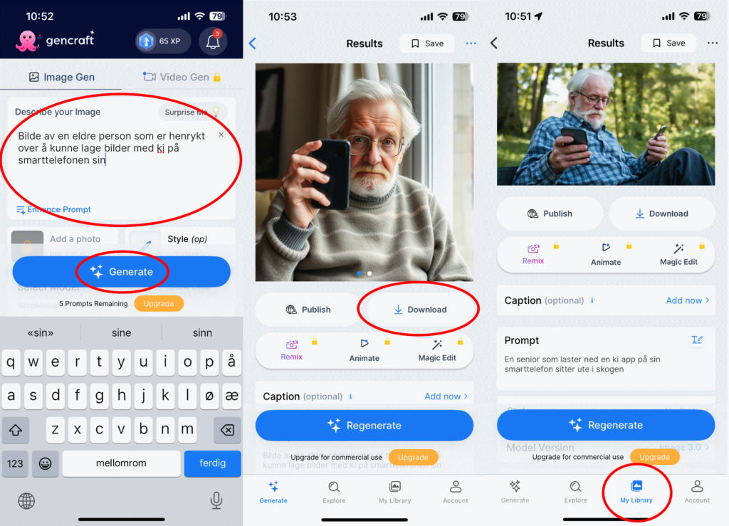 Skriv inn bildebeskrivelsen din og trykk deretter på «Generate», den store blå knappen. Det går ikke lang tid før du ser resultatet og hvis du er fornøyd med det, trykk på «Download» for å laste bildet ned til telefonen din. Hvis du har bilder du er fornøyd med kan du trykke på «My library» nederst til høyre og trykke deg inn på bildene. Da ser du bildet om prompten du brukte for å lage bildet.