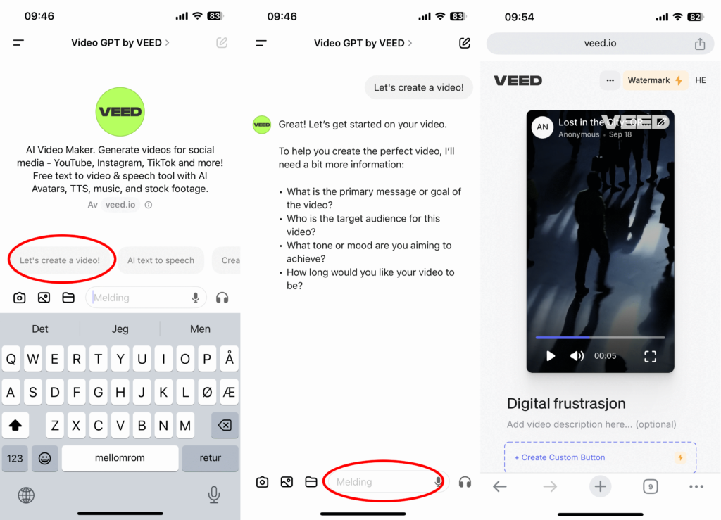 I bildet under ser du hvordan du starter opp å lage en video med veed. Du kan trykke på valget «Let’s create a video» og kommer til neste side der Veed kommer med noen forklaringer på hvordan du skal beskrive videoen din. Dessverre foregår dette kun på engelsk. Dette skriver du inn i meldingsfeltet som er merket med rødt nederst i bildet. Deretter vil du få en dialog (den tar vi ikke med her). I dialogen må du svare på enkelte spørsmål om innholdet, lengde, hvem publikum er og når Veed er fornøyd vil den generer en video. Du må i denne prosessen også opprette en konto hos Veed. Det gjorde vi enkelt på iPhone, bare valgte appleID til pålogging. Til slutt var videoen klar, den ser du bilde av til høyre i bildet under.