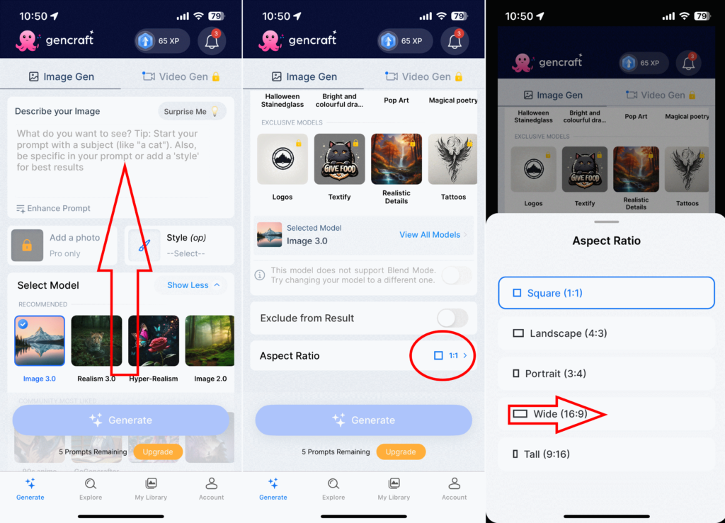 I bildet under ser du en rød pil som viser muligheten til å rulle opp til du finner «Aspect ratio». Der velger du bildeformatet. Deretter kan du velge «Style» og bildetype (Model).