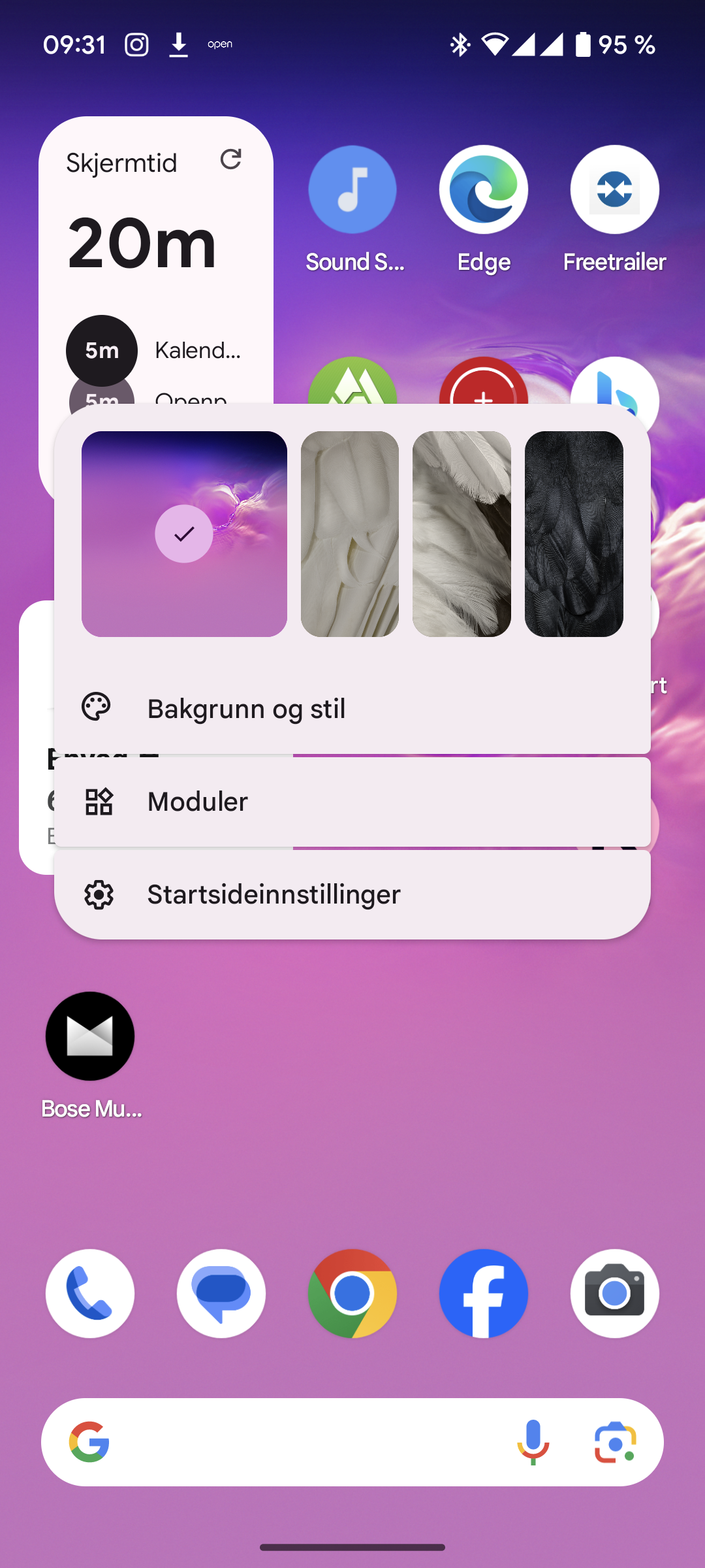 Ved hver app som har moduler er det en liten pil. Trykker du på den viser den hvilke moduler som er tilgjengelig - Trykk og hold på en modul. Nå skal du se bilder av startskjermene dine.