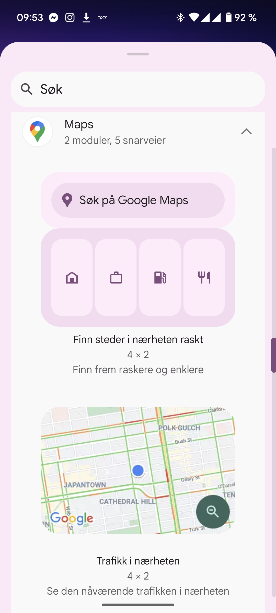 Der ser jeg modulen «Trafikk i nærheten». Legg merke til at det står 4X2. Det betyr at den trenger plass på startskjermen som tilsvarer 4 ikoner horisontalt og 2 vertikalt.