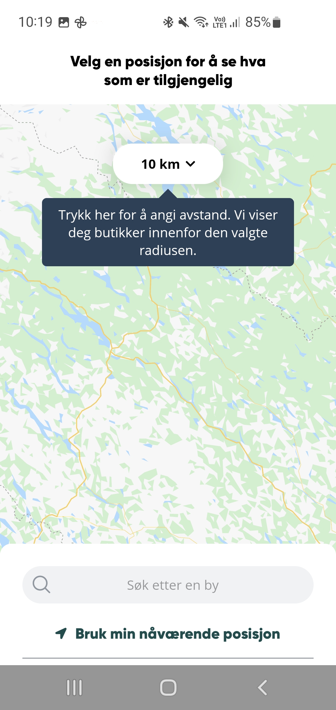 Når du er i gang, kan du søke etter en by/sted eller bruke nåværende sted («Bruk min nåværende posisjon»). Dette kan du endre senere når du vil. Du ser da hvilke bedrifter som har lagt ut pakke i nærheten. Og du ser tidsrommet pakken må hentes.