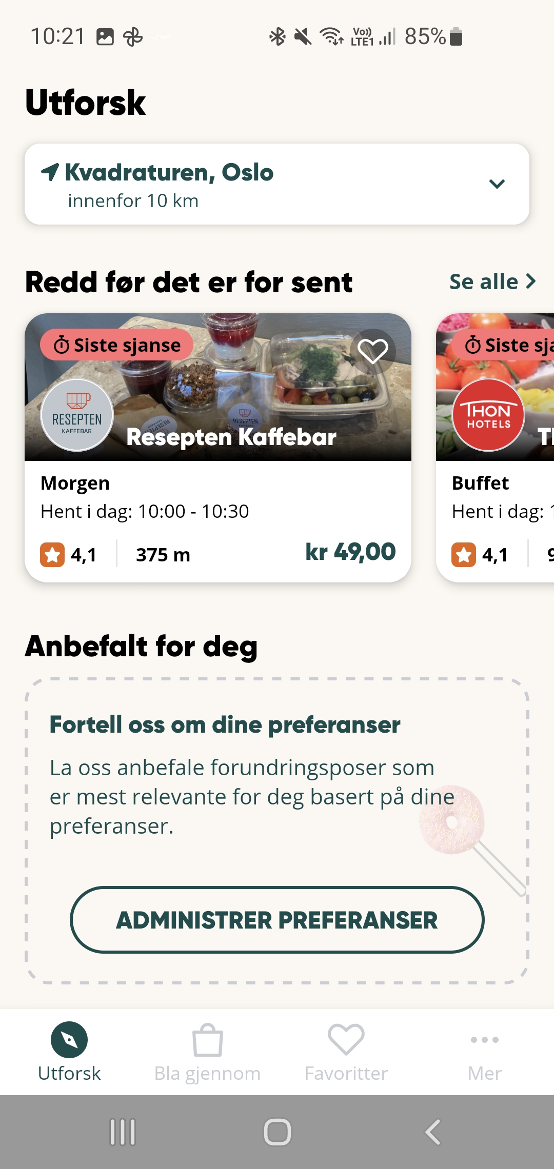 Nederst i appen ser du valgene «Utforsk», «Bla igjennom», «Favoritter» og «…» mer. Prøv å trykke på de ulike valgene og se hva som ligger der. «Bla igjennom» er nyttig for å se hvilke bedrifter i nærheten som pleier å legge ut pakker med mat. Hvis du trykker på hjertet, vil disse bli lagt under «mine favoritter» slik at du lettere finner dem senere.