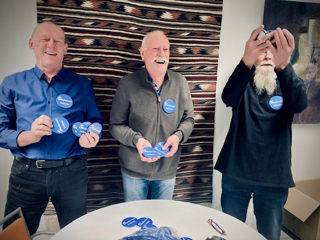Helge, Pia og Dag fra administrasjonen tester sekkene, de har plass til 15″ PC