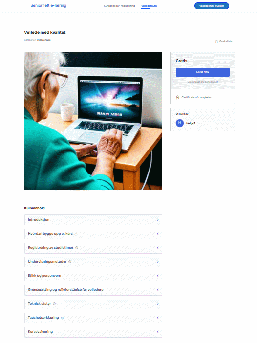 Kursportalen inneholder ett kurs, veilede med kvalitet. Her kan våre veiledere få innføring i det å veilede. Det er beregnet både på både nye og erfarne veiledere. Gjennom kurset vil du få mange tips og råd i hvordan veilede. Vi vet at veilederne er en av de aller viktigste ressursene vi har i Seniornett. Opplæringen av veilederne våre gjøres på flere måter. Foreningene lærer opp sine egne veiledere, vi kommer rundt og holder veilederseminarer og nå kan veilederne i tillegg gjennomføre veilederkurset i en nettbasert versjon.