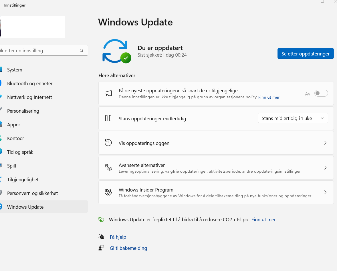 Gå heller inn i Windows Update, det finner du under Innstillinger (tannhjulet), og se om det er noen oppdateringer som ikke er installert: