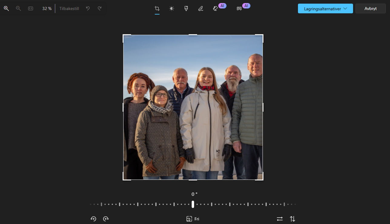 Her kan du rotere til høyre eller venstre (pilene som går i ring), flippe bildet vertikalt eller horisontalt (dobbeltpiler i hver sin retning) eller velge format (trykk på «Fri» så ser du alle valgene).